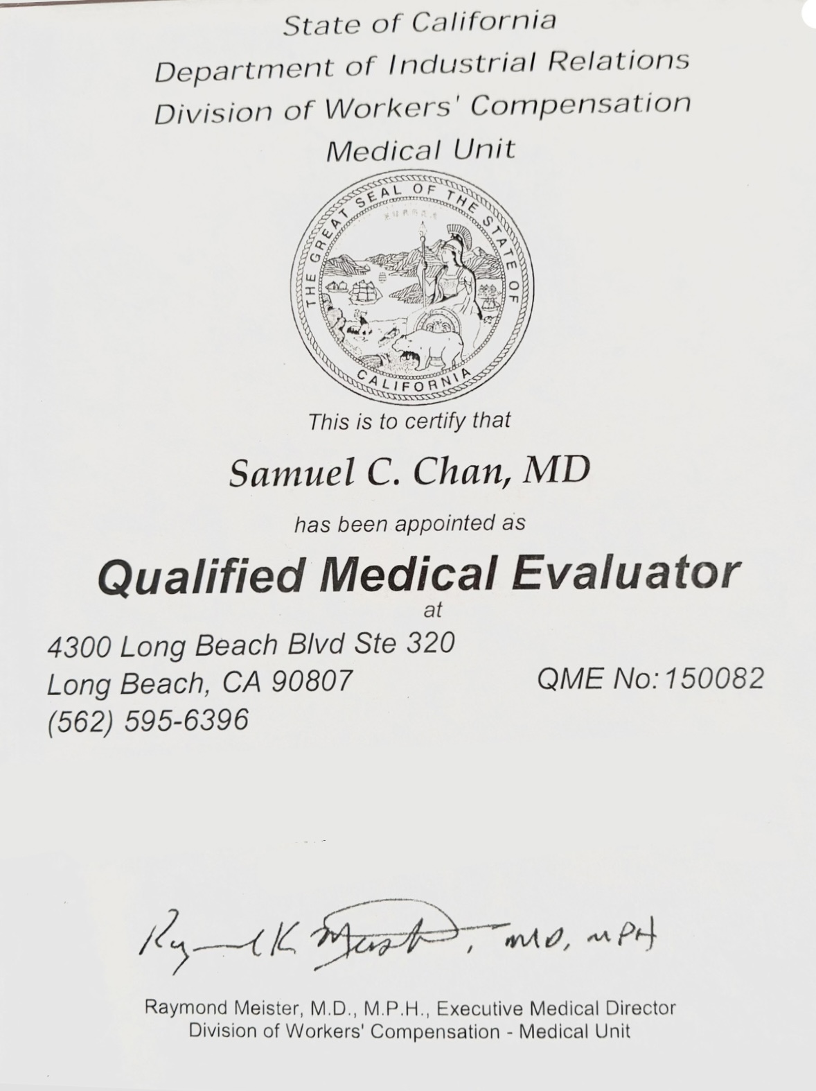 With over 50 years of medical experience, Dr. Samuel S. Chan has established himself as a respected authority with extensive experience in Workers’ Compensation, family medicine, private practice, and personal injury cases, including car accidents and Certified Qualified Medical Evaluator (QME).